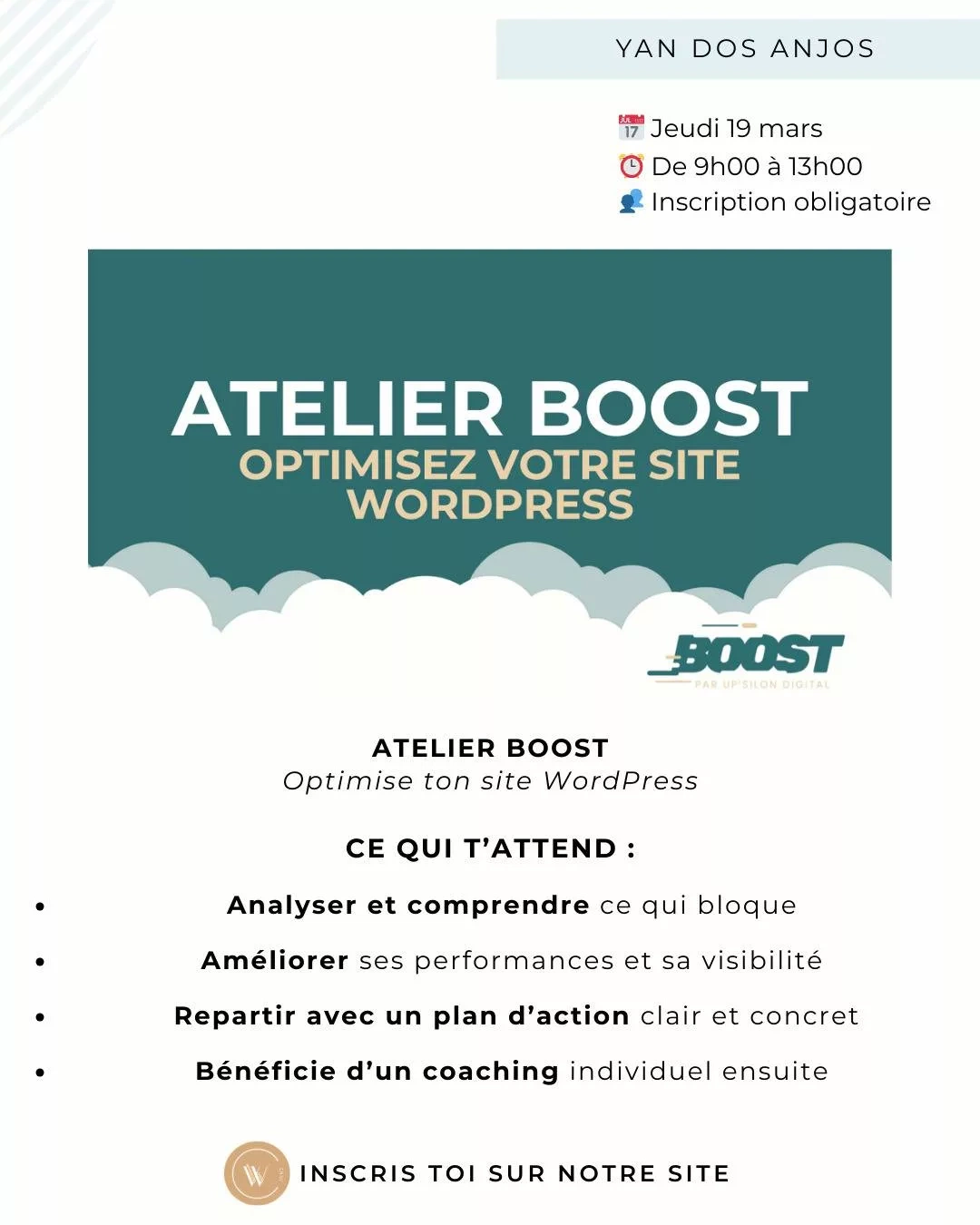 Le jeudi 19 mars 2026, le W Chill accueille un atelier pratique dâoptimisation WordPress animĂ© par Yan Dos Anjos.