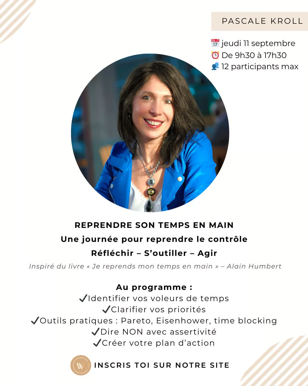 Inspirée du livre « Je reprends mon temps en main » d’Alain Humbert, elle vous donne des méthodes concrètes pour retrouver efficacité et sérénité au quotidien.